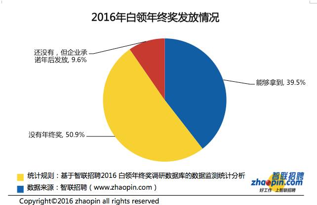 智聯招聘發布的《2016白領年終獎調查》顯示,只有39.5%的白領表示可以拿到年終獎,明顯高于2015年13.4%的比例,另外有9.6%的白領表示企業承諾會在年后發放年終獎。調查顯示,2016年年終獎的總體均值為12821元,整體水平較2015年略有上升,但仍低于2014年的13613元。金融行業和國企白領的年終獎均值最高,為1.7萬元。地區上,北京的年終獎均值最高,為15846元,上海、深圳和杭州分列其后。(美通社,2017年1月12日北京)