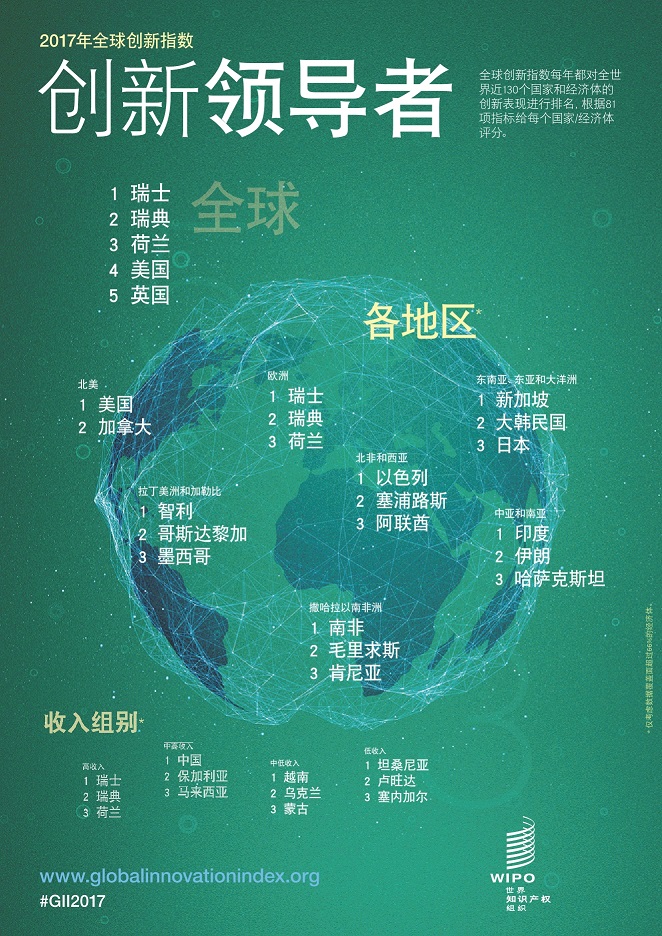 由康奈爾大學(xué)、英士國(guó)際商學(xué)院(INSEAD)和世界知識(shí)產(chǎn)權(quán)組織(產(chǎn)權(quán)組織)合編的2017年全球創(chuàng)新指數(shù)顯示,瑞士、瑞典、荷蘭、美國(guó)和英國(guó)是世界上最具創(chuàng)新力的國(guó)家,而包括印度、肯尼亞和越南在內(nèi)的若干國(guó)家的表現(xiàn)則優(yōu)于發(fā)展水平相當(dāng)?shù)耐瑑?/strong>。2017年,瑞士連續(xù)第七年位列榜首,除排名第22位的中國(guó)之外,前25名中的24個(gè)都是高收入經(jīng)濟(jì)體。2016年,中國(guó)首次成為進(jìn)入前25名的中等收入經(jīng)濟(jì)體。亞太地區(qū),排在中國(guó)之前的經(jīng)濟(jì)體分別是新加坡(全球第7),韓國(guó)(全球第11),日本(全球第14),和香港(全球第16)。(美通社,2017年6月15日日內(nèi)瓦)