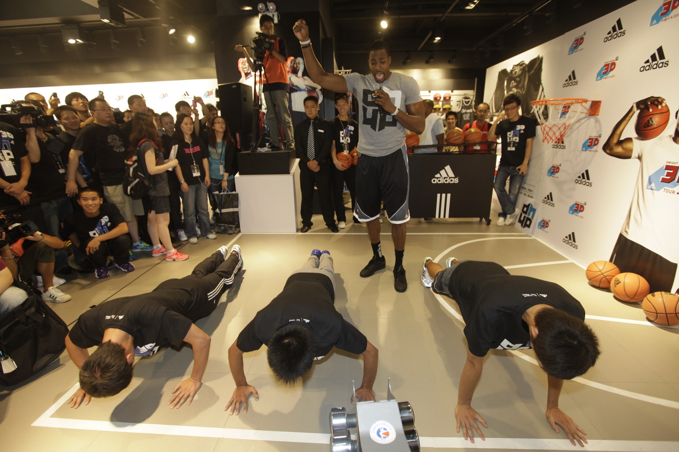 武漢的球迷對于這位 NBA 的魔獸似乎有著特別高的熱情。活動還沒開始,漢江路阿迪達斯迷你旗艦店的門口就已經擠滿了渴望與霍華德零距離接觸的球迷們。伴隨著現場主持與球迷們有節奏地呼喊,3D 魔獸終于出現。這位 NBA 力量的化身來到武漢,當然也不會吝惜與現場球迷來一場“強人三項”的力量較量:比賽限時兩分鐘,手舉10次啞鈴后完成5次仰臥起坐,然后再進行仰臥投籃,規定時間內投籃進球最多者即獲勝。霍華德在了解完游戲規則后,一馬當先,率先要求計時挑戰。3D 魔獸對于完成一整套環節表示毫無壓力,他表示相比球場上的訓練強度,這個游戲顯得既輕松又好玩。然而對于參賽的小球迷而言,啞鈴和仰臥起坐已經十分消耗耐力,最后還需要仰臥投籃,幾個回合下來便已經氣喘吁吁。搞怪魔獸在鼓勵球迷的同時還不忘對他們進行調侃,要求小球迷回去多加訓練,希望下次有機會驗收成果。