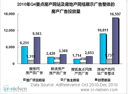 整體來看,房產(chǎn)廣告推廣項(xiàng)目數(shù)、廣告主總量、廣告創(chuàng)意數(shù)與去年同期相比都有大幅增長,其中房產(chǎn)廣告推廣項(xiàng)目數(shù)與去年同期相比增長113.4%,較為迅速。同時(shí)報(bào)告分析指出,房地產(chǎn)網(wǎng)絡(luò)展示廣告投放TOP3網(wǎng)站分別為搜房網(wǎng)、新浪房產(chǎn)、搜狐焦點(diǎn)網(wǎng)。報(bào)告顯示,2010年第四季度中國互聯(lián)網(wǎng)房地產(chǎn)行業(yè)展示類廣告推廣項(xiàng)目總量為10811個(gè),其中搜房網(wǎng)是第二名2.5倍、第三名的3.5倍;2010年第四季度中國互聯(lián)網(wǎng)房地產(chǎn)行業(yè)展示類廣告廣告主總量為1734,搜房網(wǎng)以75.9%的份額大幅領(lǐng)先;2010年第四季度中國互聯(lián)網(wǎng)房地產(chǎn)行業(yè)展示類廣告創(chuàng)意總量為16597,搜房網(wǎng)以9563領(lǐng)先第二名和第三名3-4倍的優(yōu)勢雄踞榜首。