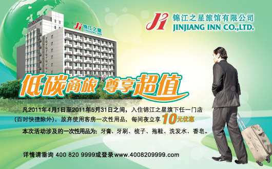 上海2011年3月15日電 /美通社亞洲/ -- 錦江之星將于2011年4月1日起在全國范圍內開展“低碳商旅,尊享超值”的環保主題活動。