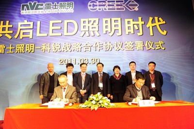 3月30日,LED 照明領域再次擲出重磅炸彈,雷士照明與科銳公司(CREE)在上海新國際展覽會簽署戰略合作協議,進行強強聯合,開啟 LED 照明高端市場發展的新篇章。雷士照明常務副總裁殷慷先生和科銳中國市場總經理唐國慶先生分別作為雙方代表簽署戰略合作協議。同時科銳副總裁兼中國區總經理施毓燦先生、中國照明電器協會理事長陳燕生先生、中國照明電器協會副理事長兼秘書長劉升平女士、中國照明電器協會副秘書長竇林平先生應邀出席,共同見證此次簽約儀式。