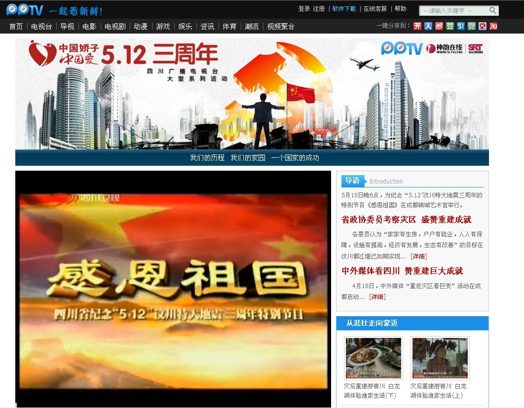 2008年5月12日,8級強震曾給汶川帶來了巨大的災難。今年5月12日當天,PPTV 網絡電視12小時同步直播“5.12特別節目:從悲壯走向豪邁”,該節目以全新的視角、多樣的播報方式,重現波瀾壯闊的抗震救災現場和恢復重建歷程,直播報道重點反映了災區這三年的變化,以突出從悲壯走向豪邁這一主題。當天12小時的直播當中,采用演播室播報、訪談、SNG 直播點、成片、短信微博互動等多種形式,見證災區三年的發展與變化。早在5月10日晚8點,PPTV 網絡電視就通過自身資訊頻道同步直播了“感恩祖國 -- 四川省紀念5.12汶川特大地震三周年”的特別節目。
