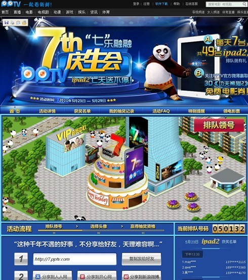上海2011年5月24日電 /美通社亞洲/ -- 2011年5月23日零點,為感謝眾多忠實擁護者7年來的陪伴,PPTV 網絡電視七周年慶生送 iPad2 系列活動正式開始。截止活動第一天抽獎結束,PPTV 網絡電視7周年活動頁面用戶排隊次數已突破5萬,7臺 iPad2 大獎以及第一批的 3D《功夫熊貓2》電影券均發至用戶手中,目前該活動仍在火爆進行中。(活動網站:http://7.pptv.com)