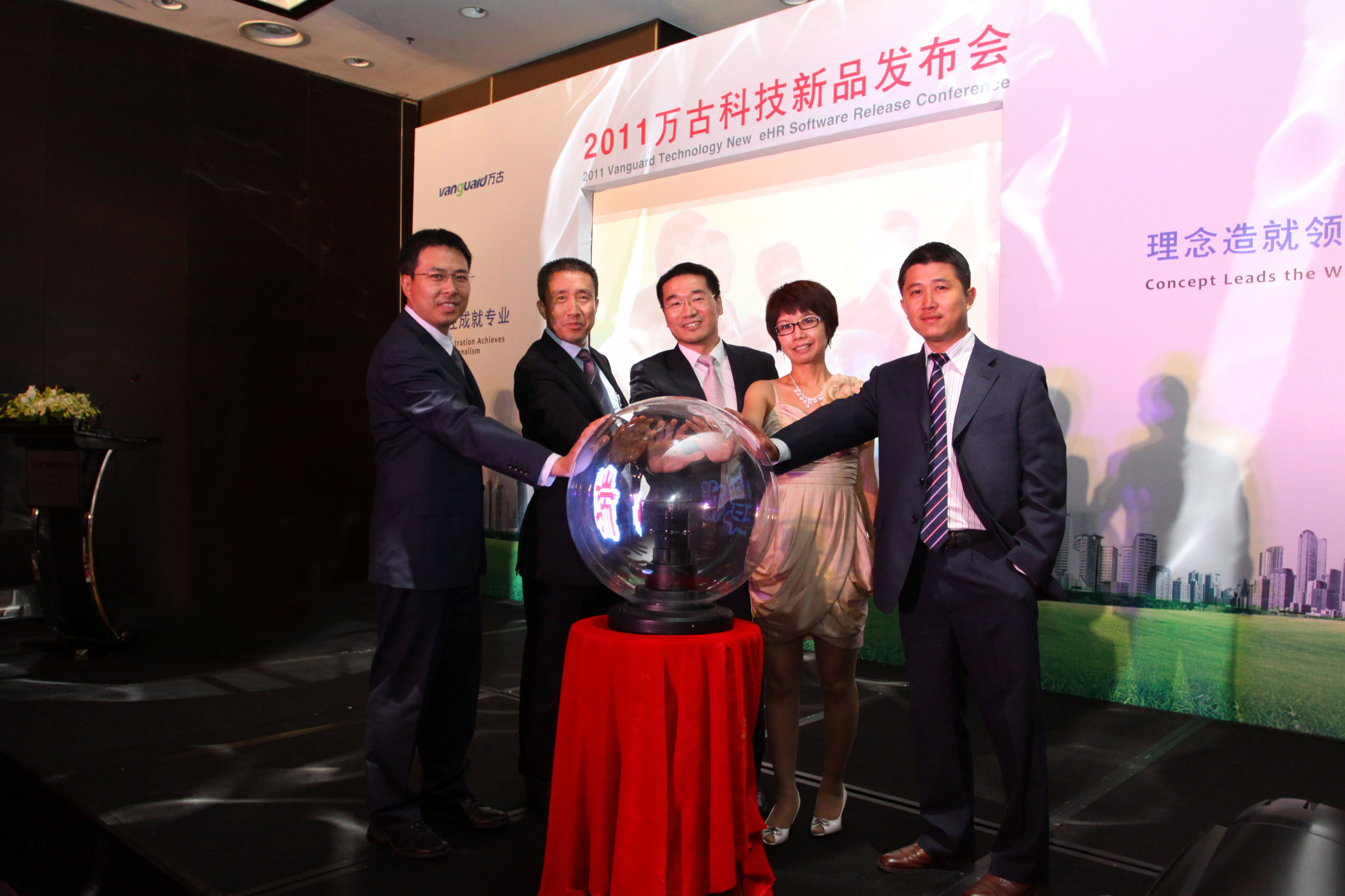 在鄧濤先生致辭結束后,發布會迎來了又一重要環節—新品啟動儀式,萬古科技 eHR 新品發布在大家的期盼下,進入最后的倒計時。萬古科技領導團隊:首席顧問鄧濤先生、總裁鮑鵬先生、總經理崔堃先生、營銷總監洪文文女士、項目總監李治國先生,在主持人的邀請下上臺就緒。此時現場燈光漸漸暗下,主持人帶領全場嘉賓一起倒數,五位領導隨著口號同時觸摸啟動球,最終啟動球在大家的感應及期待下開始閃動,萬古科技新品 logo:“Vantop”赫然閃現,現場氣氛再次達到高潮。
