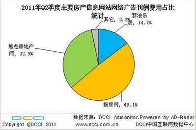 2011年Q2房產類網絡展示廣告價值估算整體達到3.01億元,其中搜房網房產類廣告價值估算高達2.02億元,占行業整體的67.0%,遠超其他競爭對手。