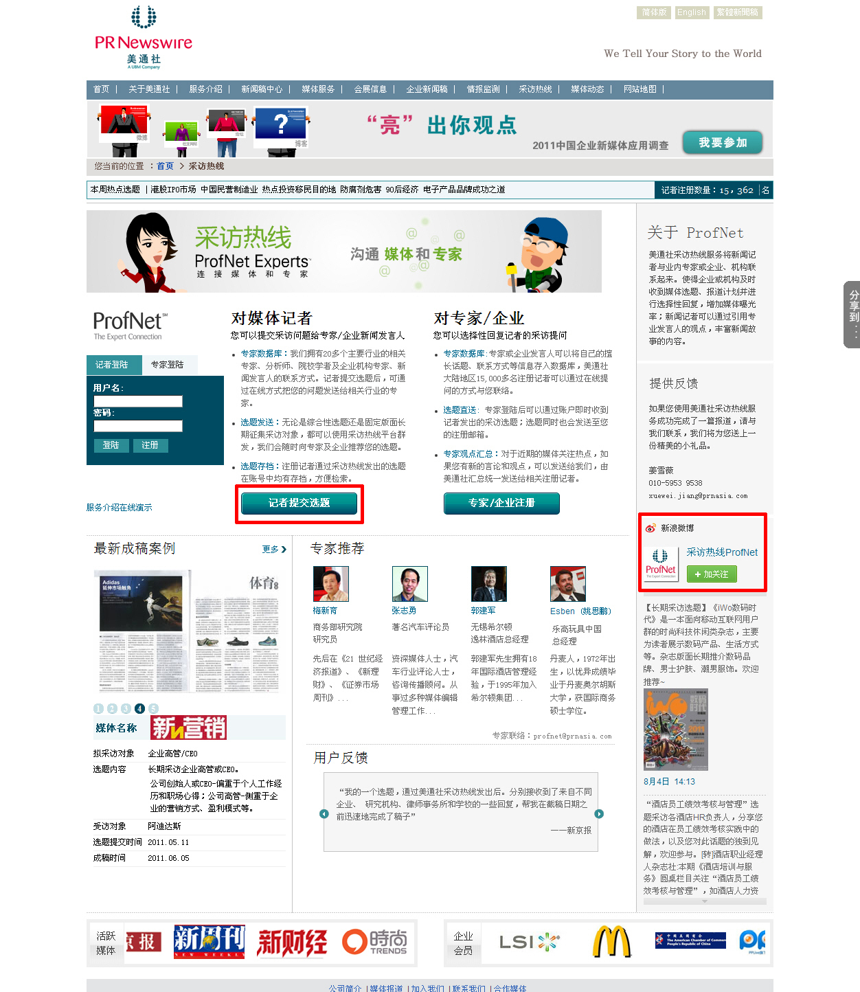 美通社中國區(qū)董事總經(jīng)理陳玉劼說:“美通社在2007年將在北美新聞界、公關(guān)界人盡皆知皆用的采訪熱線(ProfNet)平臺引入中國,為中國的媒體與專家、企業(yè)搭建起一個快速溝通的橋梁,新版采訪熱線結(jié)合中國最流行的微博等社交媒體工具,充分發(fā)揮了采訪熱線的社交互動優(yōu)勢,為媒體和專家、企業(yè)新聞發(fā)言人提供更實時、便捷的溝通交流平臺。”