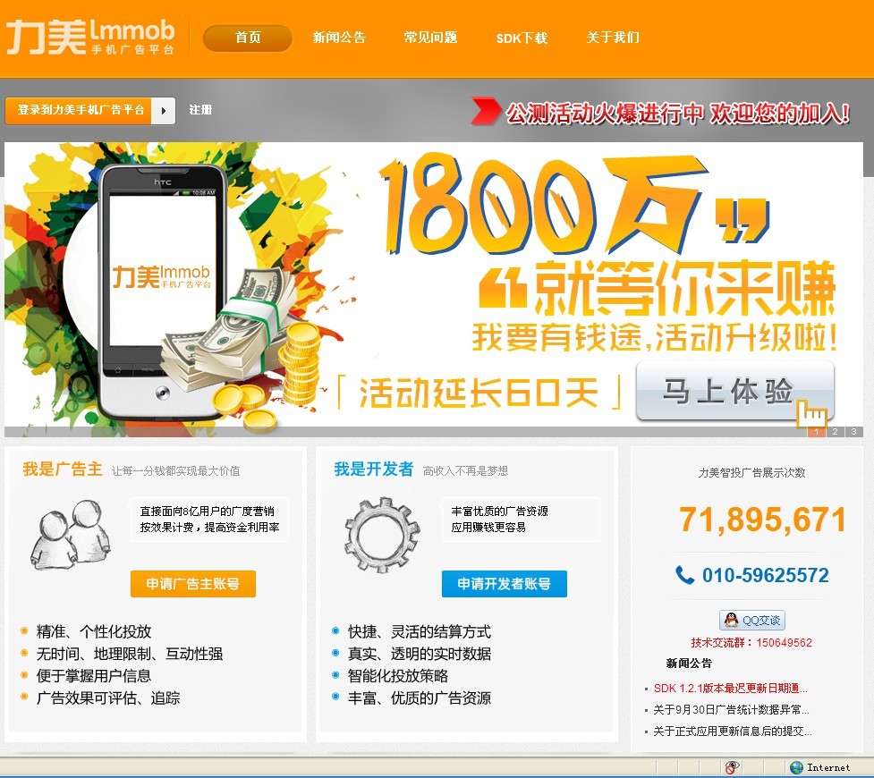 北京2011年10月24日電 /美通社亞洲/ -- 中國領(lǐng)先的移動媒體和社交媒體營銷公司力美廣告宣布,應廣大Android開發(fā)者的強烈要求,其手機廣告平臺“我要有錢途”活動將延長至12月25日。