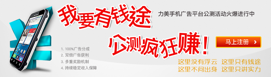 “我要有錢途”是力美移動廣告平臺7月底針對 Android 開發(fā)者推出的一項推廣活動,為通過力美平臺審核的 Android 應用提供 CPC 較低0.3元、CPM較低4.6元的保障。同時,力美移動廣告平臺還和開發(fā)者們簽訂了1800萬的收入保障協(xié)議,承諾1萬日均展示量可獲得9000元以上收入,10萬日均展示量可獲得90000元保底收入。截至10月底,已經(jīng)有一千多名開發(fā)者報名并上傳應用。