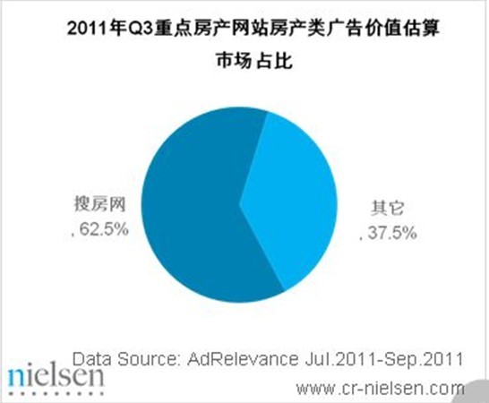 搜房網(wǎng)2011年 Q3房產(chǎn)類廣告價值估算高達2.79億元,占行業(yè)整體的62.5%,遠超其他競爭對手。