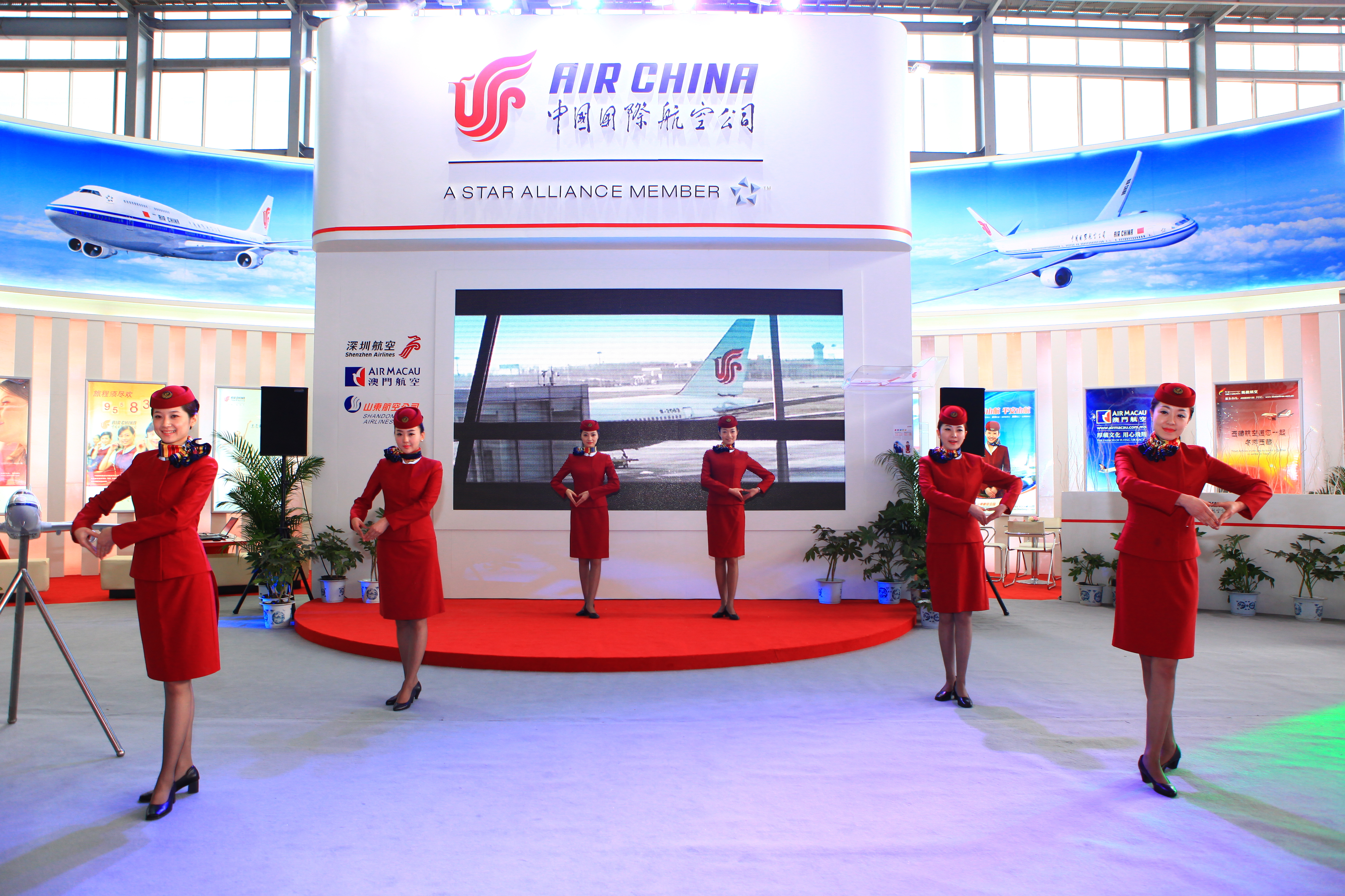 國航展臺整體突出了國航“賓四海 禮天下”的宣傳主題。展臺分隔成舞臺區、產品展示區、商務洽談區等幾個部分,將國航的機隊、航線網絡、電子商務和豪華公務艙等特色產品運用視頻、互動、圖片、體驗、資料發放等形式貫穿成整體。