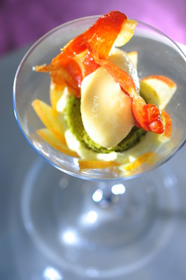 美饌杰作絕不局限于主菜,創意甜品的匠心巧究更將西班牙黑毛豬的傳奇演繹得淋漓盡致,彰顯主廚非凡的廚藝。希艾力為極品西班牙火腿嚴選理想配角,包括希臘乳酪冰沙、蜜瓜雪葩、綠茶蛋糕、香桃燉蛋及酸忌廉木薯粉。五項材料的和合交融,正好以清爽淡雅的味道烘托出火腿的天然芳香,成就了一道復雜而明快的甜品 -- 希臘乳酪冰沙配蜜瓜雪葩、西班牙火腿、綠茶蛋糕、香桃燉蛋及酸忌廉木薯粉。