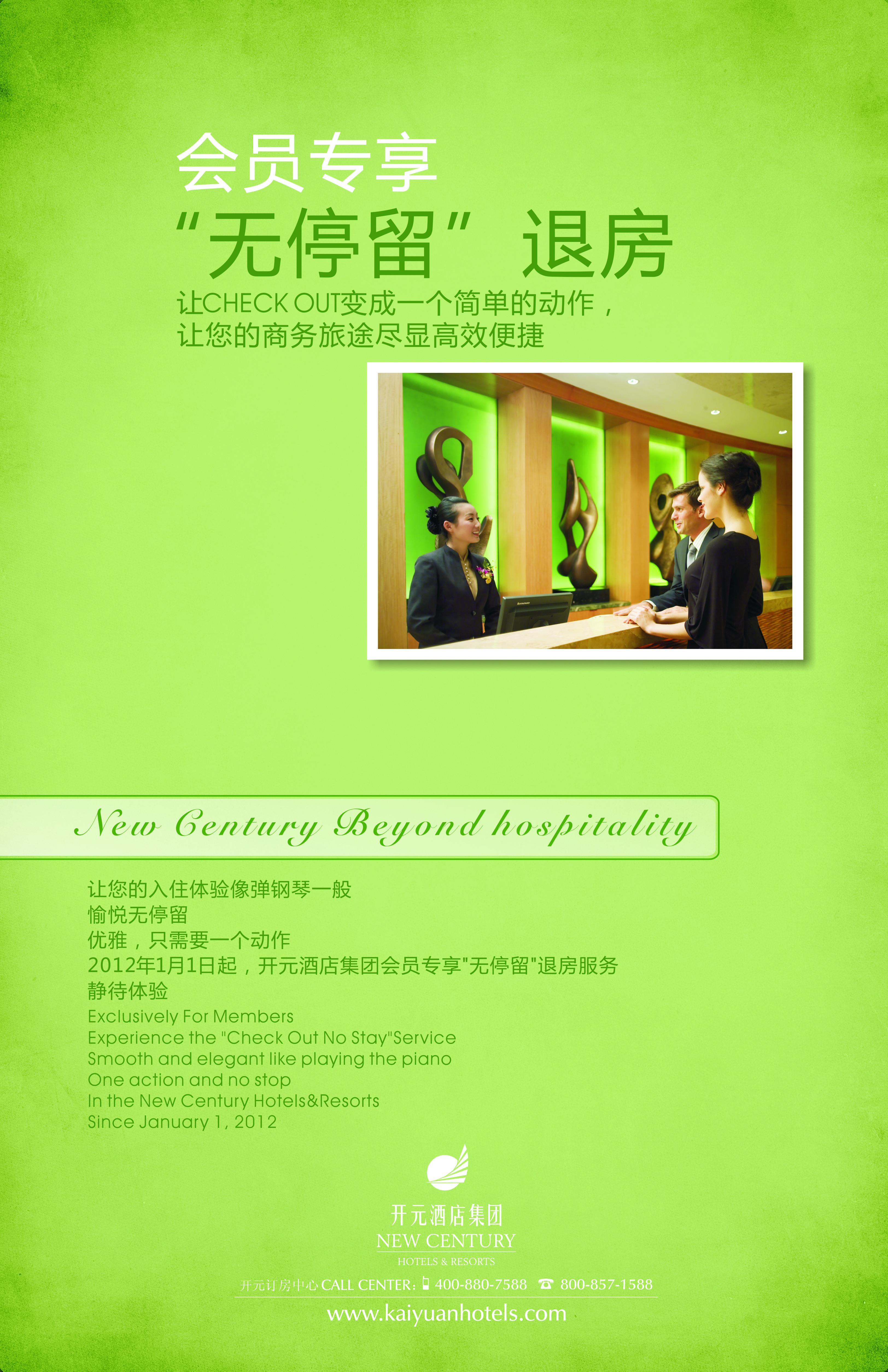 “無停留退房”服務(wù)計(jì)劃是開元酒店集團(tuán)針對商祺會會員在退房時推出的快捷服務(wù),是指在現(xiàn)有免查房服務(wù)的基礎(chǔ)上,為客人提前結(jié)清所有費(fèi)用,完成結(jié)賬手續(xù),賓客在退房時只需將房卡歸還至前臺即可離店。這一人性化的服務(wù)推出旨在提升開元商祺會會員禮遇及附加值,亦是突出開元人性品質(zhì)、真摯關(guān)愛的品牌核心價值。
