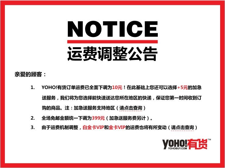 2012年起,YOHO!有貨將原來每單15元的運費下調(diào)至10元,購物滿一定金額可免郵的門檻也由原來的500元下調(diào)至399元。YOHO!有貨物流負責人許凱介紹:“在快遞漲聲一片的大環(huán)境下,我們承擔差價補貼來下調(diào)運費,希望降低用戶潮流網(wǎng)購的門檻。在此基礎上,仍會保持以往優(yōu)質(zhì)的物流服務,運費降了,服務不能降。”針對節(jié)假日的購物高峰,YOHO!有貨還推出加急送服務,從訂單審核、物流制單、揀貨包裝、分撿出庫等各環(huán)節(jié)采取優(yōu)先措施,更大程度上滿足不同用戶的物流需求。