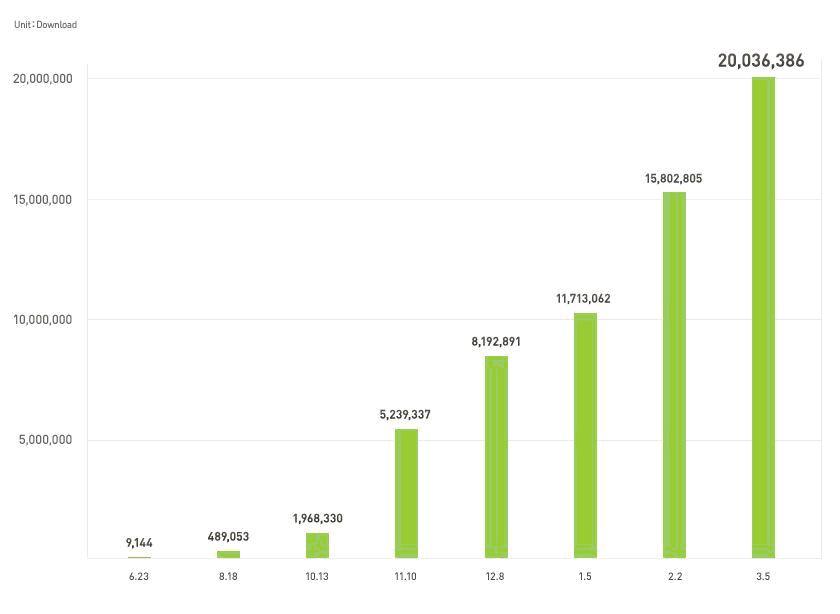 結(jié)果是在下載量達到1500萬后僅一個月的時間里再增500萬,自服務開始后8個月內(nèi),累計下載量達到了2000萬次。