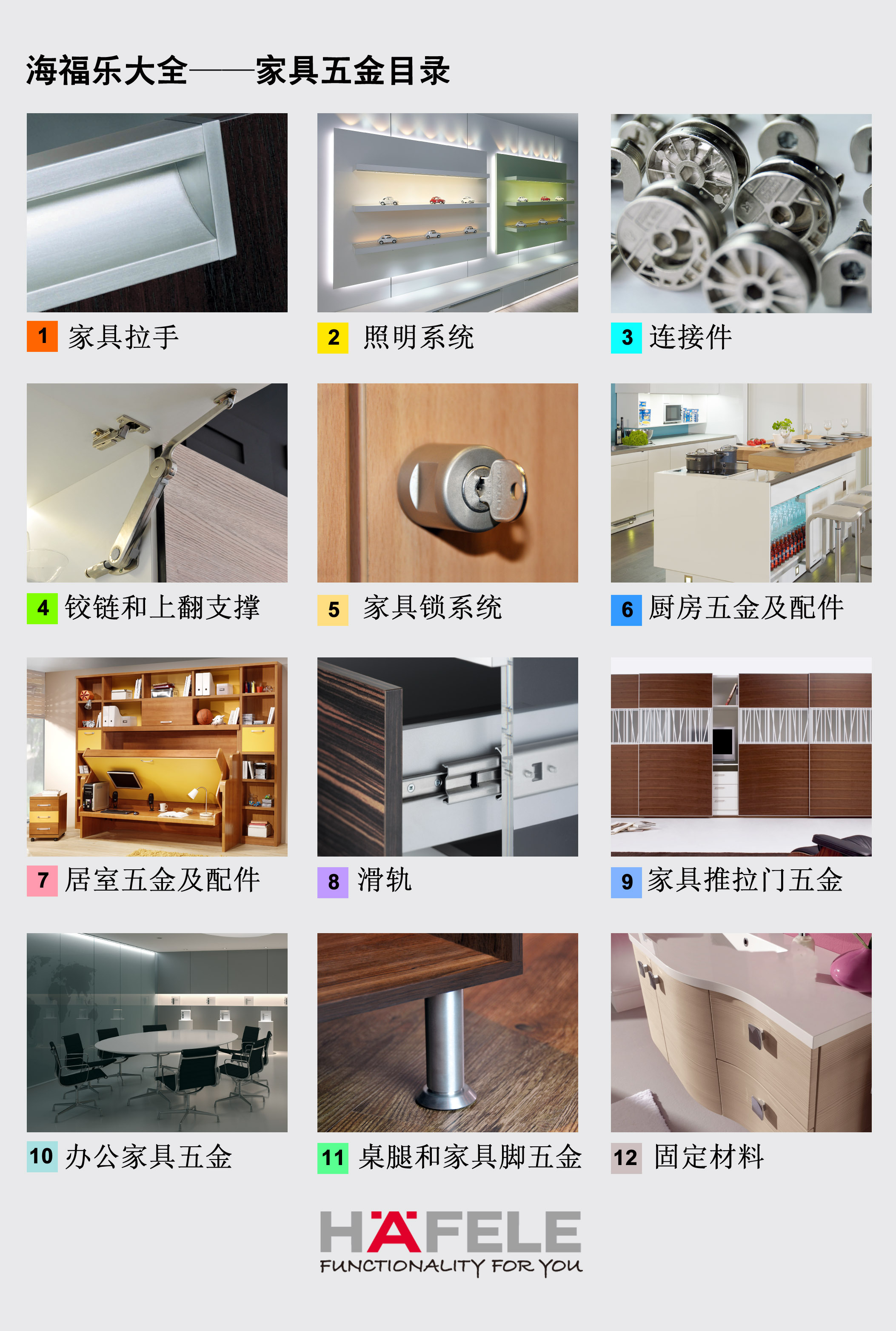 作為全球第一家提出五金“功能性”理念的企業,海福樂不斷調整其產品種類,為采購人員和室內設計師提供解決方案和設計靈感。此次,海福樂針對中國市場,在600多頁的產品手冊中收納產品3000余種,涵蓋了家具及家居中的方方面面,如家具拉手、照明系統、連接件、鉸鏈和翻門支撐、家具鎖系統、廚房五金及配件、居室五金及配件、滑軌、家具推拉門五金、辦公家具五金、桌腿和家具腳五金以及固定材料(PVC、螺釘和膠粘劑)。