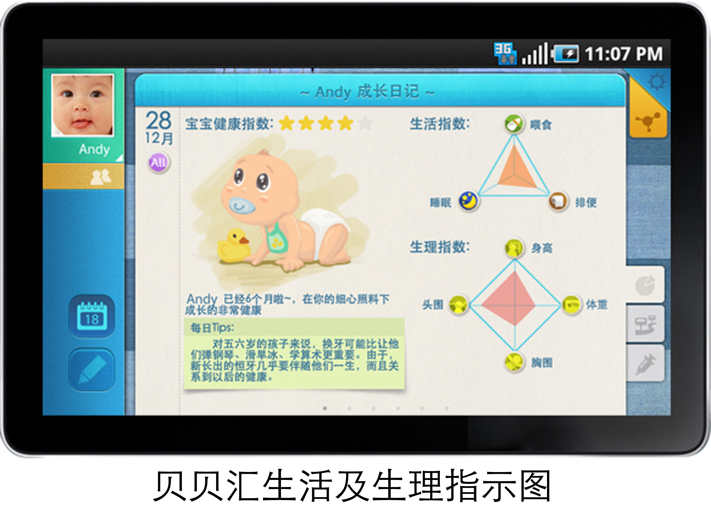 貝貝匯支持多用戶、多種移動智能終端(pad、手機等),及多種網(wǎng)絡(luò)(3G、Wifi、GPRS等),并支持離線操作,特有的簡單化界面保證操作方便快捷。以雜志的形式記錄了寶寶成長過程中的點點滴滴,全面跟蹤寶寶的健康情況,為寶寶的家長提供更好的育兒體驗的同時,還可作為醫(yī)生輔助診斷的幫手: