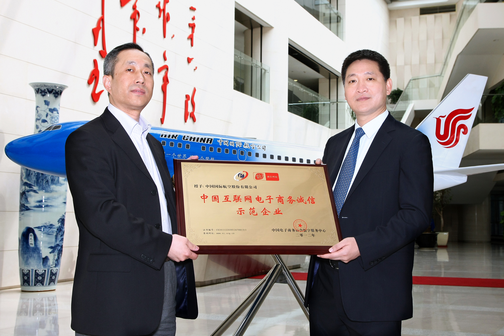 北京2012年5月8日電 /美通社亞洲/ -- 近日,中國國際航空股份有限公司(以下簡稱:國航)副總裁王明遠在國航總部接見中國電子商務協(xié)會副秘書長萬東輝先生一行,并接受中國電子商務協(xié)會為國航頒發(fā)的“中國互聯(lián)網(wǎng)電子商務誠信示范企業(yè)”榮譽牌匾。國航商委領導及部門負責人到場見證了這一光榮歷史時刻。