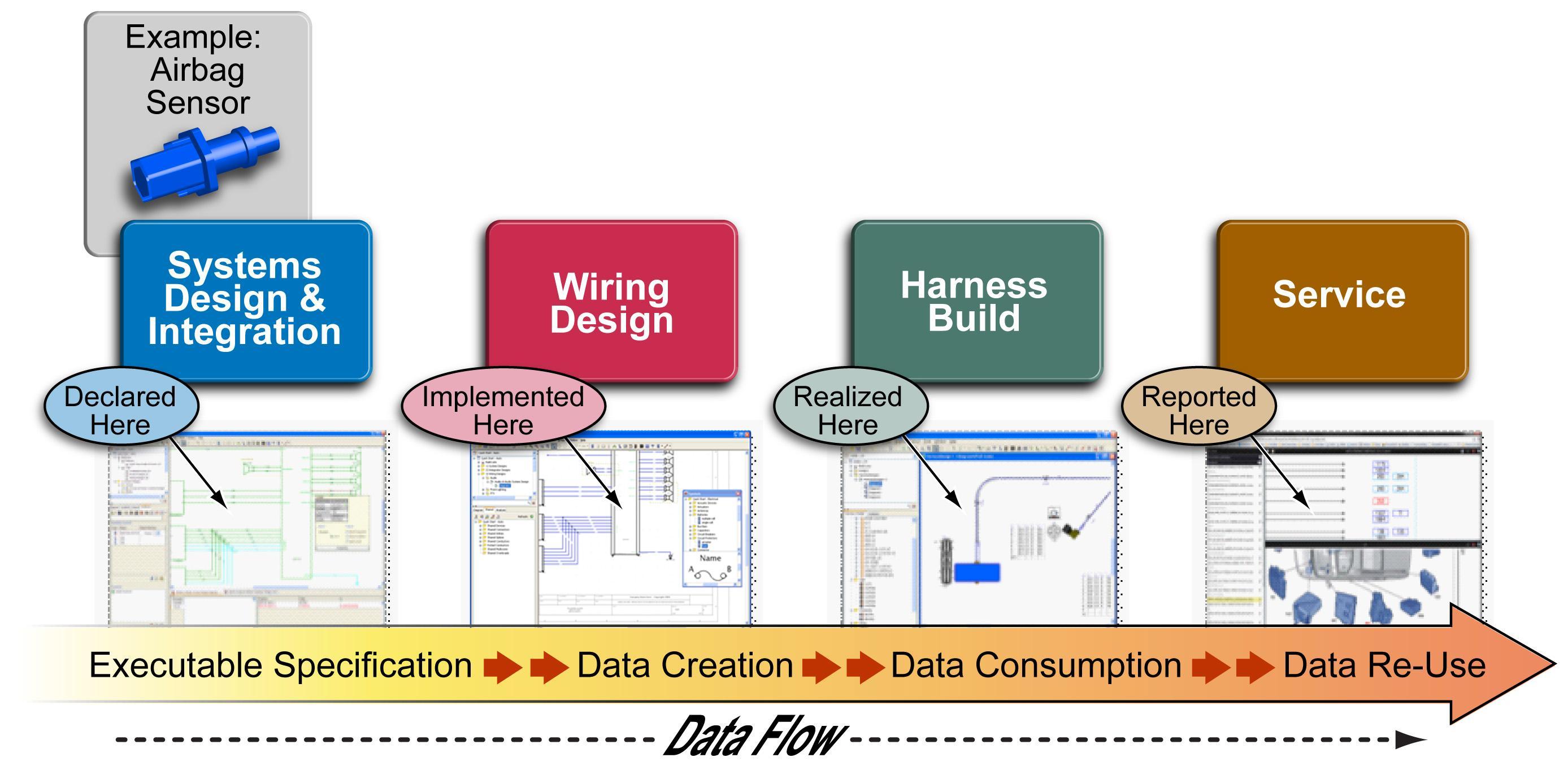 汽車電氣系統設計的傳統流程是依靠實際的工程圖紙,但是圖紙僅僅是從邏輯到物理設計展示平臺所累計數據的一方面,而無法包括一些其他角度的看法:從采購的角度(該設計中需要什么零件?);從工程的角度(當開關打開時,該馬達會啟動嗎?)甚至是審核者的批示:這是當前的設計嗎?被簽署了嗎?