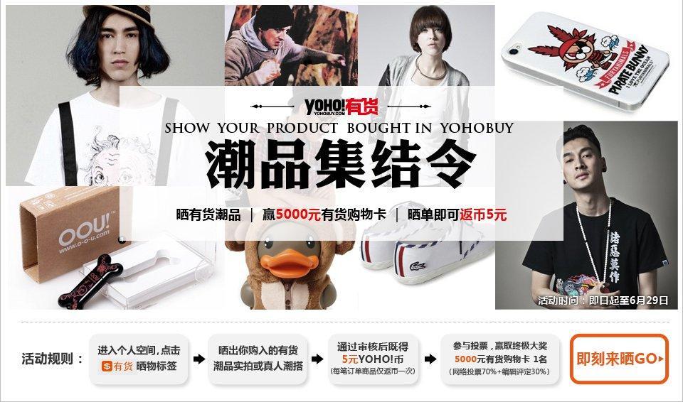 整個(gè)6月,潮品集結(jié)令都明晃晃地在大家眼前,只需要進(jìn)入YOHO.CN發(fā)布自己在YOHO!有貨購(gòu)入潮品的圖片,即可得到5元返幣。返幣事小,也只是YOHO!有貨對(duì)暴“曬”潮人的一份心意回饋,“曬”出潮品味、潮態(tài)度才是大事。為了讓暴“曬”活動(dòng)更刺激,也更配得上“有貨潮品集結(jié)令”這個(gè)名號(hào)的大氣磅礴,YOHO.CN特?fù)艹?000元購(gòu)物卡一張,作為終極大獎(jiǎng),頒發(fā)給此次活動(dòng)表現(xiàn)最搶眼的那一位。