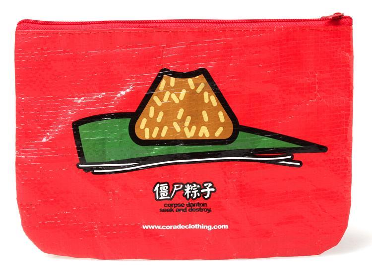 本次僵尸小袋延續一貫的怪趣風格,細看這位CORPSE,絕對不乏潮味,頭頂的‘粽'字,大膽作風。嘴邊粽粒殘香,吃完還不忘高呼“I LOVE ZONGZI”,可愛至極;而紅與黑早已成為這位“小僵尸”的專屬色,紅的一面象征著活力與熱情配以神秘靜寂的黑,盡顯僵尸本色,有沒有一種HOT的感覺?材質上出于功能考慮,依舊選用編織覆膜,防水、耐磨、易清洗。整體而言,不繁復的設計卻也足夠引人側目 -- 既有僵尸元素,又囊括了傳統的粽子,可謂是混搭潮流的應景之作。