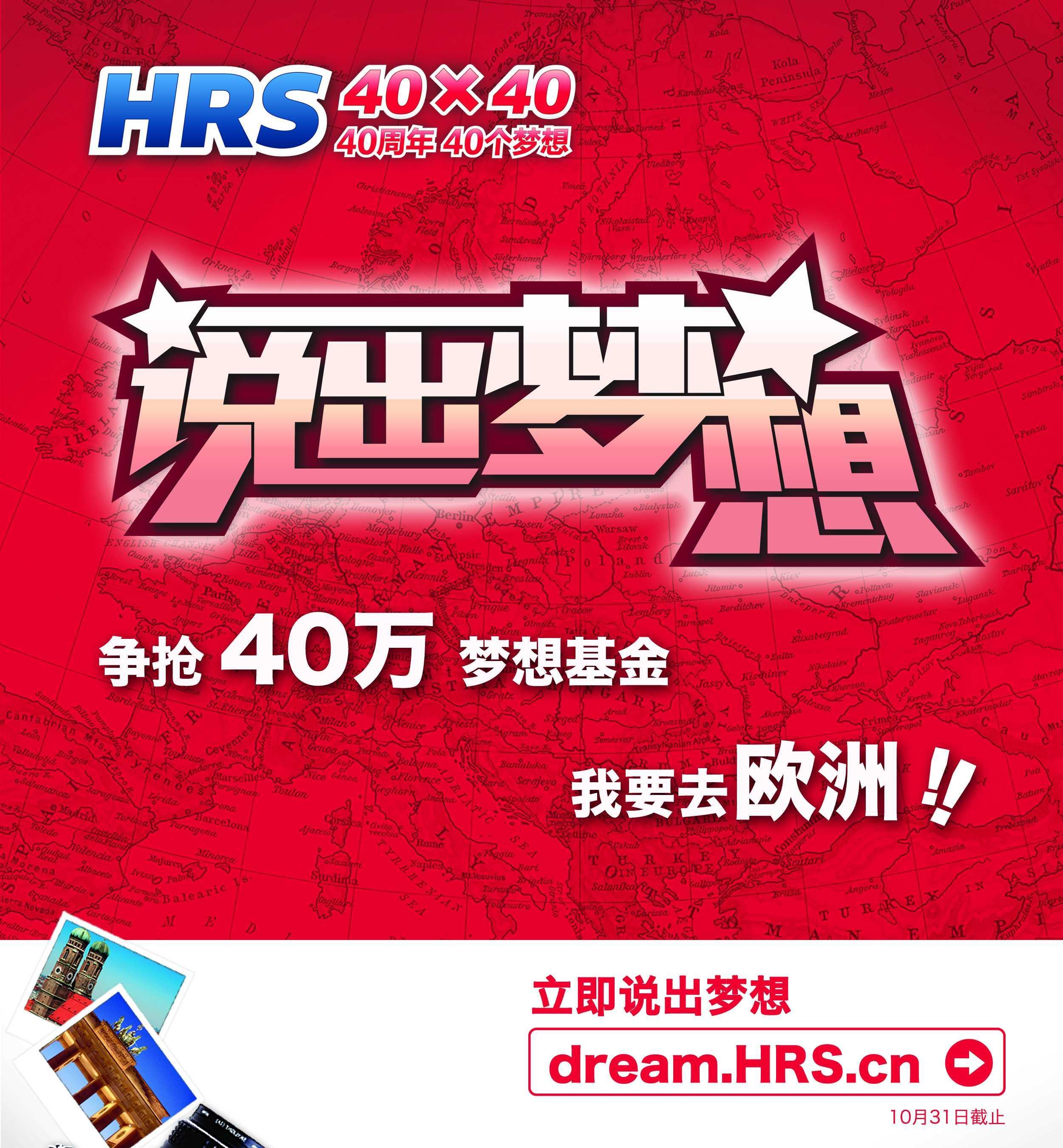 “HRS 40周年 40個夢想”于9月1日正式啟動。您可以通過HRS中文官方網站HRS.cn,進入“HRS40周年 40個夢想”的活動頁面進行報名,寫下您的歐洲夢想。通過網上投票,以及HRS和權威旅游媒體的評比,其中40名參加者將獲得HRS提供的1萬元的夢想基金,以輕松完成歐洲之旅的夢想。獲獎名單將分別于9月底和10月底公布,詳情請登陸http://dream.hrs.cn/。