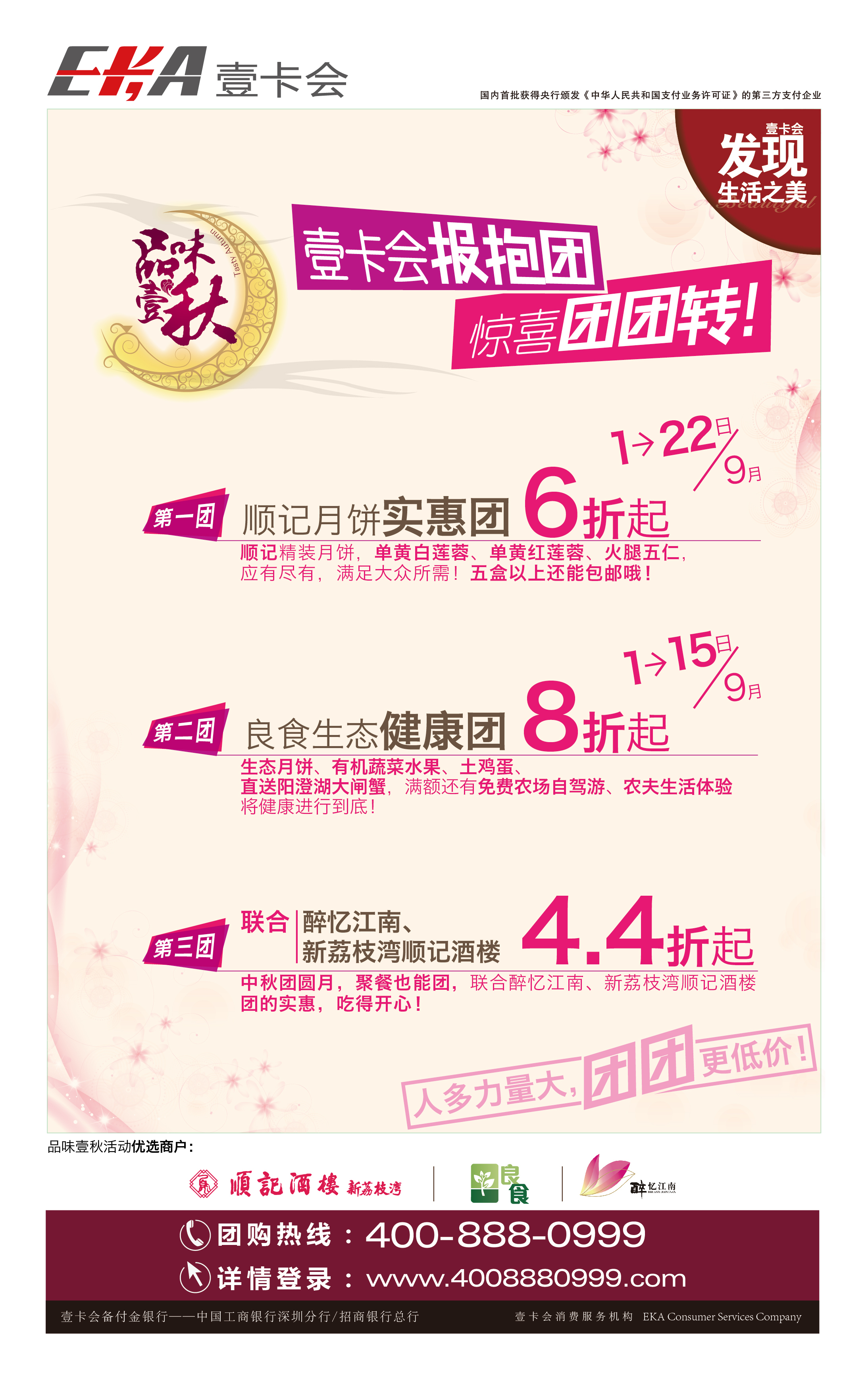 壹卡會·發(fā)現(xiàn)生活之美.品味壹秋大型團購活動可接受企業(yè)或個人報團,詳詢400-888-0999或登錄www.4008880999.com進行自助團購。(活動僅限深圳地區(qū))