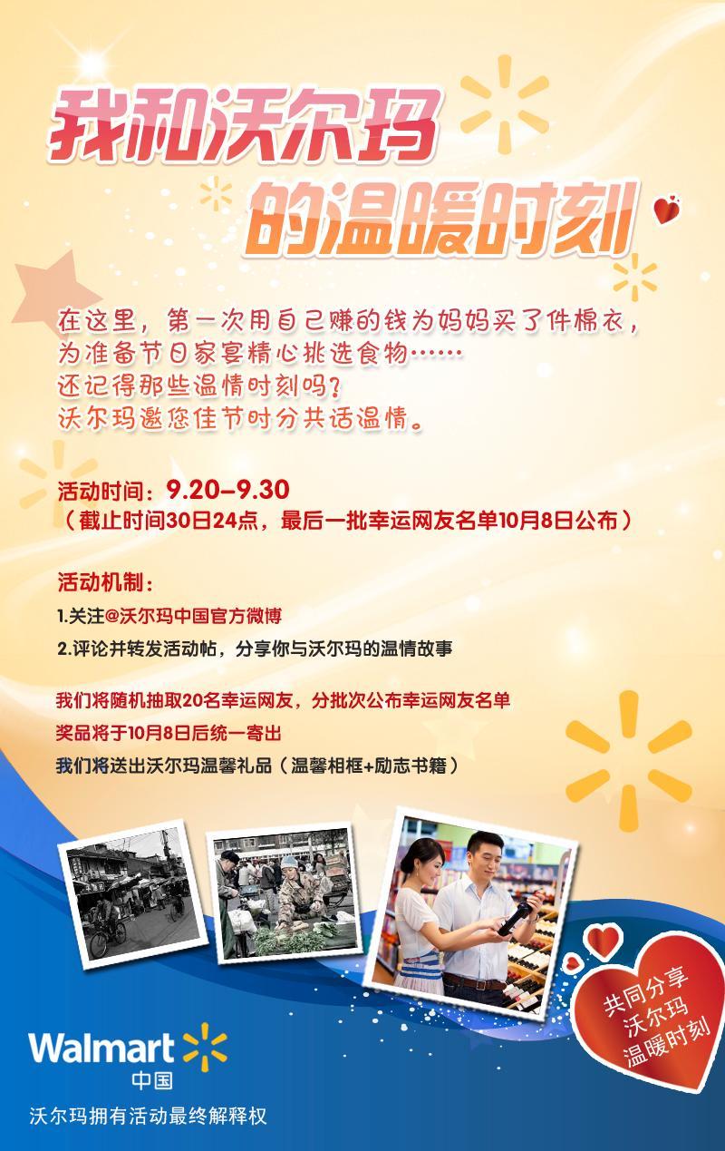 @沃爾瑪中國官方微博正式亮相的同時,將啟動“我與沃爾瑪的溫暖時刻”網友線上活動,邀請網友在中秋佳節共話溫情,一起回憶美好生活的點滴。網友在9月20日至30日期間,關注@沃爾瑪中國官方微博,轉發活動貼,并分享他們與沃爾瑪的溫情故事,將有機會獲得沃爾瑪精心準備的溫馨相框和勵志書籍。