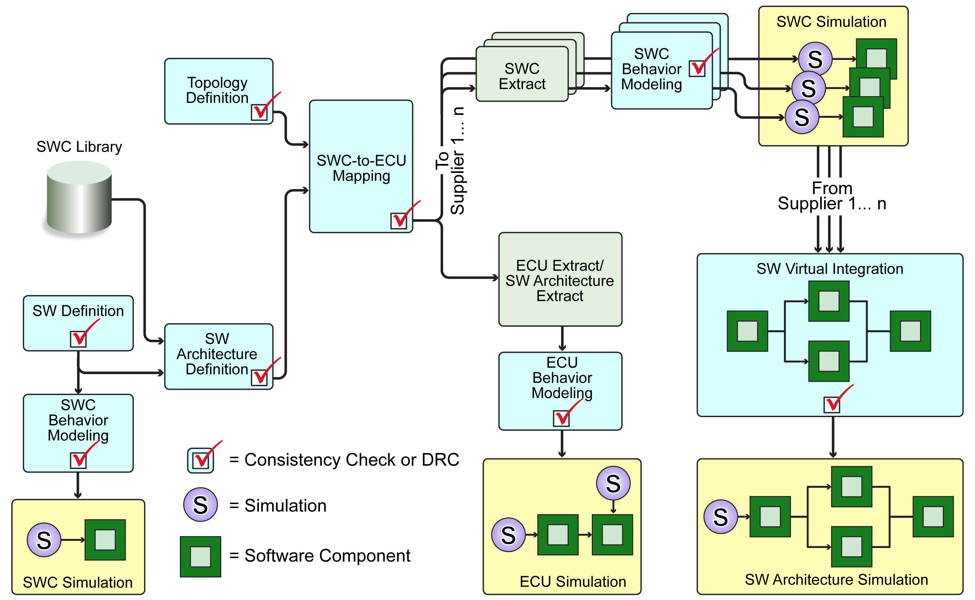 AUTOSAR 流程包括軟件構件和行為設計、軟件架構設計、電子控制單元和拓撲定義,以及功能分布等。圖1介紹了這些步驟的進展順序,從左到右大致提供了設計的流水線。根據原始設備制造商和供應商之間的協議,構件設計的不同情景、工作分配方式和封裝會對開發過程的本質產生影響。開發過程本身包含連續不斷的一致性檢測,這在圖1中用檢測符號顯示了出來。模擬程序也是從單一功能的軟件構件開始,直到別的架構模型結束(如下圖所示):