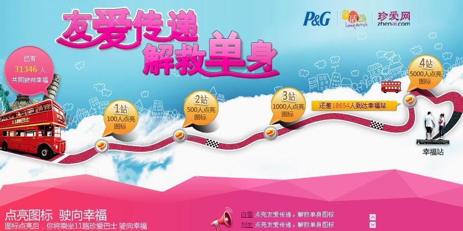 此次活動集合了珍愛網(wǎng)、寶潔以及國內(nèi)各大電商網(wǎng)站(天貓、京東商城、亞馬遜、一號店、蘇寧易購、繽購網(wǎng)、當(dāng)當(dāng)網(wǎng)),全網(wǎng)覆蓋為解救單身提供了更全面和方便的方式。在生活家網(wǎng)站上參與 “‘友’愛傳遞,解救單身”活動,分享情感專家的脫光秘籍并@上你的單身好友,即可參加iPad 2抽獎,更可獲得在所選電商平臺的寶潔產(chǎn)品購物券,以優(yōu)惠價格購得產(chǎn)品并造就“脫光”大變身;單身好友更有機會被抽中獲得珍愛網(wǎng)2999元的珍愛通紅娘服務(wù)。通過該活動注冊成為每日前1000名的珍愛網(wǎng)新用戶,亦將獲得試用會籍擁有3枚珍愛幣,以此購買禮物可更好地接近心儀對象。珍愛網(wǎng)負責(zé)人表示:“過去普通會員只能向?qū)Ψ健颓锊ā瑓⑴c該活動獲得珍愛幣,就可以有更多示愛表白的機會。在寶潔‘脫單’產(chǎn)品的幫助下再乘勝出擊約見心儀會員,將是一次加速脫光的好機會!”