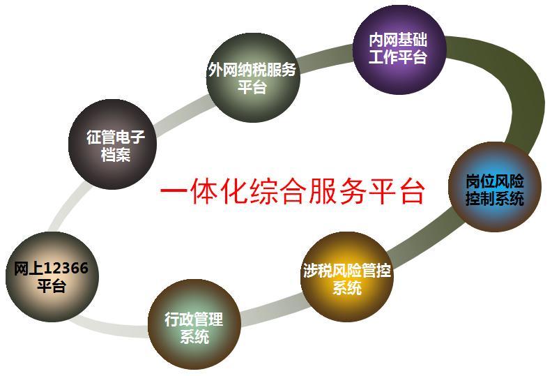 該平臺實現了內部行政管理、風險控制、績效考評的一體化流程管理,從而實現內網基礎工作平臺、外網納稅服務平臺、行政管理平臺、風險控制平臺、決策數據平臺的“五臺合一”。該平臺包含8大功能系統,分別為:內部基礎工作平臺、網上納稅服務平臺、征管電子檔案系統、崗位風險控制、考核評價、數據挖掘與管理應用系統、行政管理系統。同時,該平臺覆蓋20余項功能:如稅務登記、發票管理、認定管理、稅收優惠、證明管理、外網納稅服務、風險預警、政務管理、財務管理、人事管理、信息資源管理、教育培訓管理、后期管理等。“一體化綜合服務平臺”的完成,有效地整合了稅局服務資源,提升了納稅服務的質量和效率。