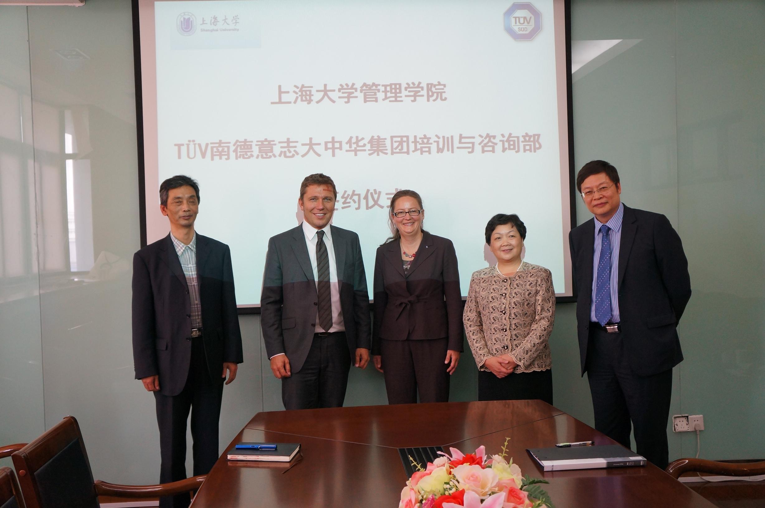 上海2012年11月20日電 /美通社/ -- 2012年10月24日,上海大學管理學院與TUV 南德意志大中華集團在上海大學舉行了合作諒解備忘錄簽約儀式。上海大學管理學院黨委書記樊春妹、副院長李懷勇、TUV南德意志集團培訓咨詢國際業務拓展副總裁韓碧緹(Brigitte Hanemann)、執行管理委員會成員柯偉楠(Werner Kraus)、TUV 南德意志大中華集團培訓與咨詢部總監洪楓博士共同出席了簽約儀式。