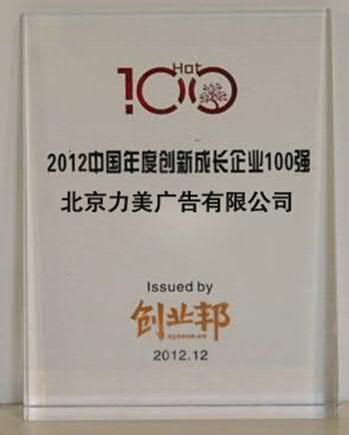 北京2012年12月10日電 /美通社/ -- 近日,由創業邦 (cyzone.cn) 主辦的“2012創業邦年會暨‘創業邦100’年度頒獎典禮”在北京千禧大酒店隆重舉行。本屆年會以“夢想照亮現實”為主題。經過激烈的角逐與多方評估、審核,國內領先的移動營銷解決方案提供商 -- 力美廣告傳媒,憑借其創新且領先的綜合實力,喜獲“創新成長企業100強”稱號。