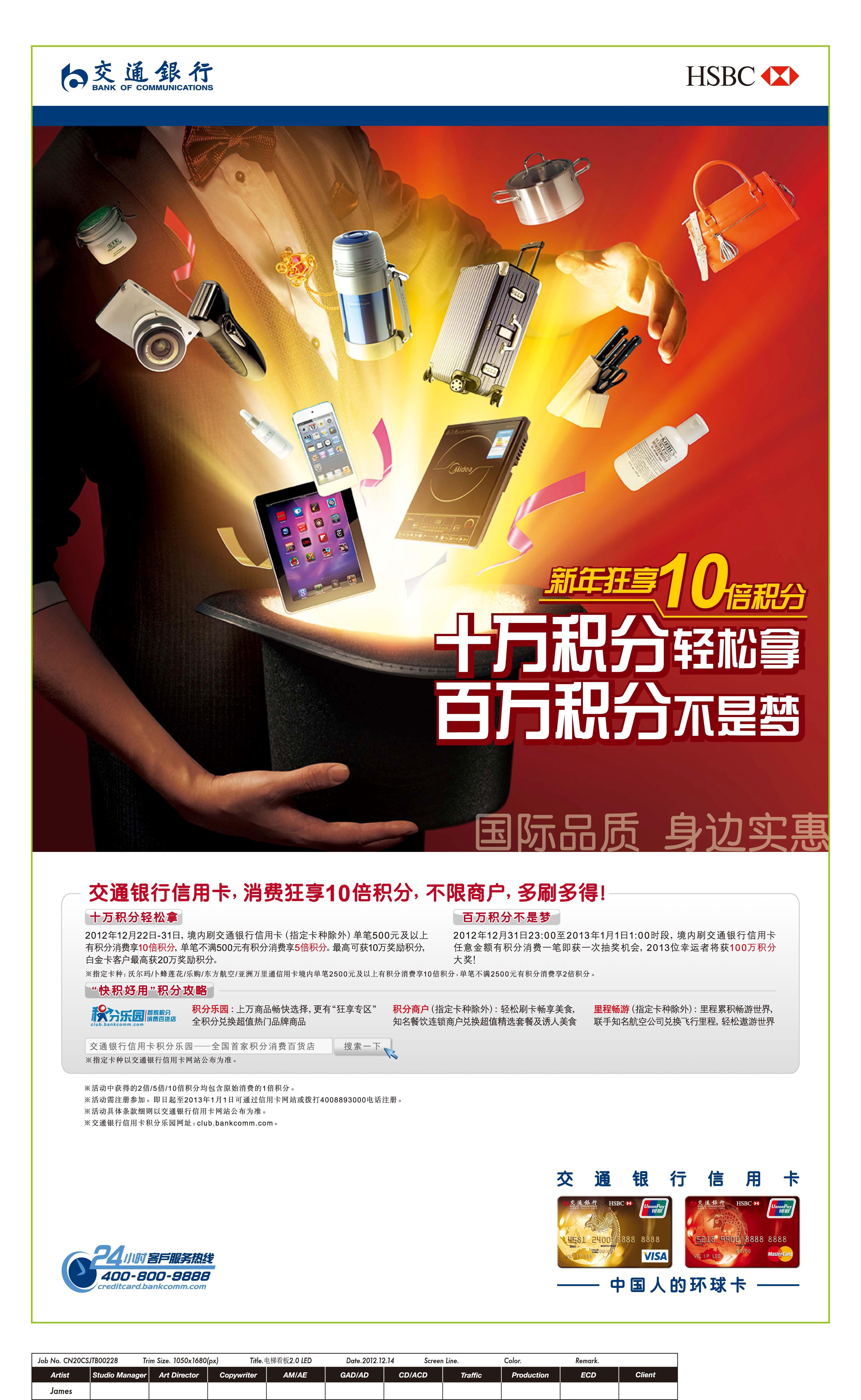 上海2012年12月19日電 /美通社/ -- 近期,交通銀行信用卡將推出“10萬積分輕松拿 百萬積分不是夢”活動,為年末這一片繁榮的購物景象錦上添花。交通銀行信用卡持卡人境內刷卡滿額就可獲得高達5至10倍的積分獎勵,在12月31日至1月1日更有機會輕松贏得百萬積分大獎!滿足購物需求的同時,還可以享受交通銀行信用卡的積分豪禮,這樣的雙重驚喜,必定讓年末的血拼季更加充滿誘惑。