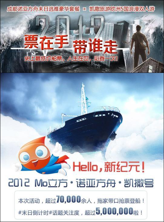 2012年12月17日,末日倒計時5天,Mo立方迎合時下熱門的世界末日話題,攜手“拯救休閑時光”的成都諾亞方舟酒店,以及“歐洲旅游專家”凱撒旅游成都分公司,推出聯(lián)合微博營銷活動“票在手,帶誰走”,參與活動的用戶即可獲得諾亞方舟酒店的限量船票,更有機會贏取凱撒旅游成都分公司價值20000多的歐洲5國11日豪華浪漫雙人游。