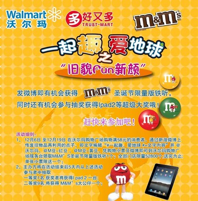 即日起至2月9日,全國范圍的沃爾瑪購物廣場、好又多門店還攜手可口可樂,邀顧客“新年抽大獎,iPad mini拿回家”。凡在任一沃爾瑪、好又多門店購物滿一定金額,且采購的商品包括可口可樂任意產品,即可參與抽獎。每店設一名特別獎,將獲得WLAN機型16GB iPad mini一臺;10名幸運獎,將獲得可口可樂汽水一箱(330毫升24罐裝)。各門店將于2月17日進行抽獎活動,并與獲獎顧客聯系(詳情請咨詢店內服務臺)。