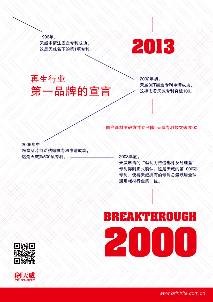1988年才在珠海成立的天威打印機色帶制造廠是中國第一家打印耗材制造廠,盡管在全球耗材巨頭面前,天威資歷很淺,但早在創業之初,天威領頭人賀良梅就確立了自主創新的戰略。現在天威擁有2000多項專利申請,包括近百項國外專利申請。專利技術涉及激光、噴墨、碳粉、墨水及各種原材料和零部件,已涵蓋打印耗材的各個領域。天威沒有資本運營的神話,不靠惡性競爭的捷徑,卻在這個被原裝打印耗材專利壁壘重重包圍的行業里取得了跨越。