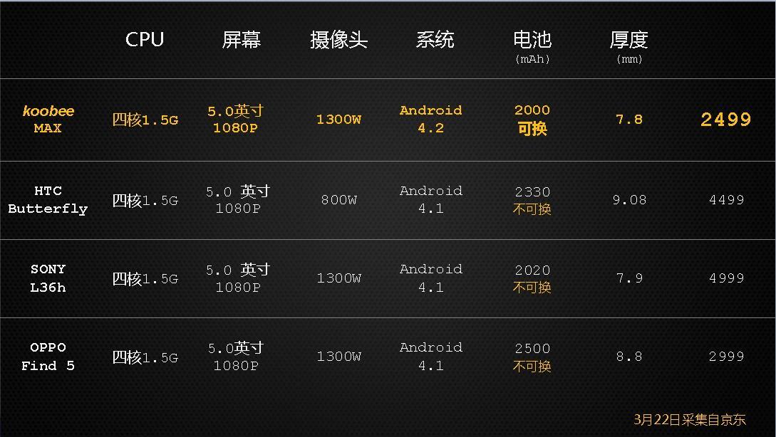 koobee 四核旗艦MAX在發(fā)布會上公布售價為2499元,京東活動預訂期間,下單立減200元,售價只需2299元。此次活動中贈送的大禮包份量也是相當?shù)呢S厚。擁有28nm四核處理器、5寸1080p屏幕、1300萬像素配置的酷比旗艦機型MAX,2299元的零售價相當具有吸引力,而這也是目前小編得知的較低價格5寸1080p四核旗艦機型,直接秒殺了傳說中性價比之王的“小米2”。而以2499元的售價來看,koobee MAX也是目前市場上在售機型中性價比較高的四核1080p手機。