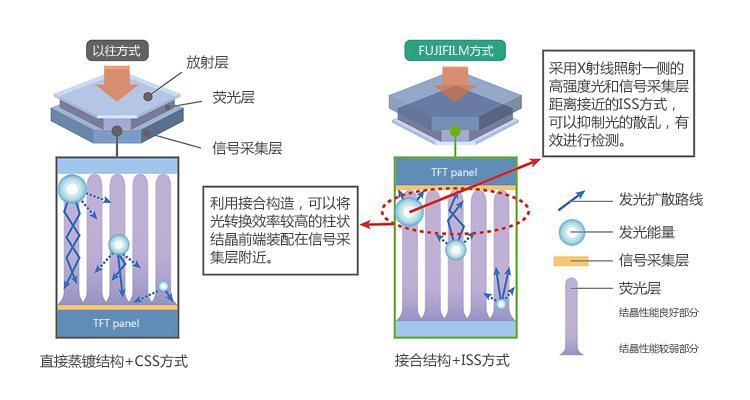 用于一般間接變化型FPD的CSS(Conventional Side Sampling,即傳統(tǒng)的透過(guò)側(cè)采集)方式中,X射線照射部位設(shè)置熒光層,發(fā)射部位設(shè)置信號(hào)采集層 (TFT panel)。CSS方式下,X射線發(fā)射部位發(fā)出的高強(qiáng)度光在到達(dá)信號(hào)采集層的過(guò)程中,容易發(fā)生衰減和散亂,使X射線信息損失較大。另一方面,在富士膠片獨(dú)有的“ISS技術(shù)”中,在X射線照射部位設(shè)置信號(hào)采集層,縮短了X射線在到達(dá)信號(hào)采集層之前經(jīng)過(guò)的的距離,從而可以有效接收X射線檢測(cè)出發(fā)出的光。此外,沒(méi)有采用將CsI柱狀結(jié)晶之直接蒸鍍于信號(hào)采集層,形成CsI柱狀結(jié)晶的一般“直接蒸鍍結(jié)構(gòu)”,而是采用了光轉(zhuǎn)換效率高,結(jié)晶性能優(yōu)越的CsI柱狀結(jié)晶先頭部分和信號(hào)采集層貼合的“接合結(jié)構(gòu)”,從而使高畫質(zhì)化成為可能。(請(qǐng)參考圖1)