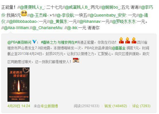 4月21日上午,PBA正式通過支付寶公益向壹基金捐出善款20萬元,并通過微博向所有支持微博愛心籌款活動的網友公示,PBA也是唯一一家以“全體會員”的名義進行捐款的電商企業(yè),這一舉動得到了廣大會員的一致贊譽,在善款捐出后愛心籌款微博再度被轉發(fā)3萬多人次,人們紛紛以蠟燭、愛心傳遞等表情轉發(fā)微博支持這一公益行動。