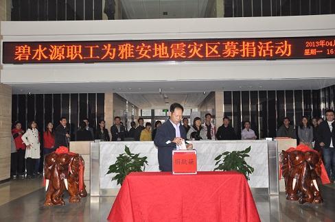 北京2013年4月23日電 /美通社/ -- 4月20日上午8點(diǎn)02分,四川省雅安市蘆山縣發(fā)生的7.0級(jí)地震,牽動(dòng)億萬(wàn)中國(guó)人的心。碧水源公司不忘社會(huì)責(zé)任與使命,4月22日董事長(zhǎng)文劍平帶頭在公司發(fā)起“情系災(zāi)區(qū),抗震救災(zāi)”活動(dòng),決定向地震災(zāi)區(qū)提供50萬(wàn)資金和50萬(wàn)凈水設(shè)備捐助,共計(jì)100萬(wàn)元,用于救災(zāi)援助。碧水源公司此次捐贈(zèng)的凈水設(shè)備正是災(zāi)區(qū)急需物資,可以有效地解決災(zāi)區(qū)人民飲用水困難問(wèn)題,緩解災(zāi)區(qū)人民巨大的生活壓力。碧水源公司已通過(guò)中國(guó)扶貧基金會(huì)實(shí)施捐贈(zèng),并安排好具體的物資運(yùn)送工作。碧水源應(yīng)對(duì)及時(shí),于救援黃金72小時(shí)內(nèi)完成捐贈(zèng)。