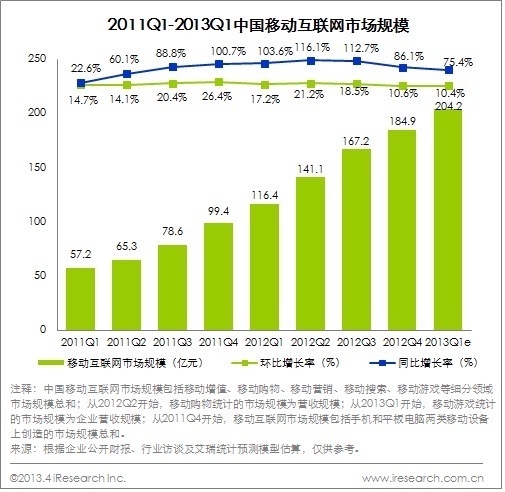 北京2013年5月16日電 /美通社/ -- 根據(jù)艾瑞咨詢統(tǒng)計(jì)數(shù)據(jù)顯示,2013Q1中國(guó)移動(dòng)互聯(lián)網(wǎng)市場(chǎng)規(guī)模為204.2億元,同比增長(zhǎng)75.4%,環(huán)比增長(zhǎng)10.4%。經(jīng)過(guò)過(guò)去兩年的高速增長(zhǎng),移動(dòng)互聯(lián)網(wǎng)在盈利模式、產(chǎn)業(yè)格局等方面進(jìn)入關(guān)鍵性的一年。