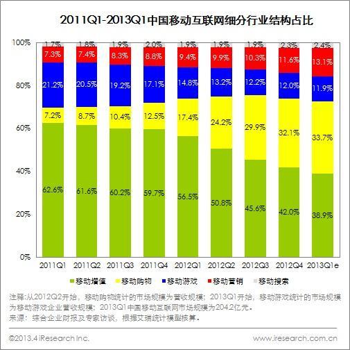 2013Q1 由于是網(wǎng)購(gòu)的淡季,移動(dòng)購(gòu)物在整體市場(chǎng)中的占比增幅較小,然而移動(dòng)購(gòu)物的市場(chǎng)依然保持了較高增長(zhǎng);移動(dòng)增值雖然仍是移動(dòng)互聯(lián)網(wǎng)占比較高的細(xì)分行業(yè),但其占比持續(xù)下降,傳統(tǒng)的增值業(yè)務(wù)不斷被其他領(lǐng)域擠壓,新興增值業(yè)務(wù)體量尚小;移動(dòng)游戲增速較為平穩(wěn),在其他領(lǐng)域增速較高的背景下市場(chǎng)份額也處于下降趨勢(shì);而新興的移動(dòng)搜索及移動(dòng)營(yíng)銷基數(shù)較小,增速較高,占比也處于快速增長(zhǎng)狀態(tài)。艾瑞預(yù)計(jì)未來(lái)移動(dòng)購(gòu)物將成為移動(dòng)互聯(lián)網(wǎng)較大細(xì)分行業(yè)。