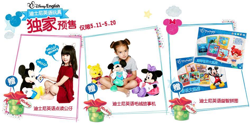 獨家預售迪士尼英語玩具系列包括迪士尼英語點讀公仔、毛絨故事機、智力拼圖?!暗鲜磕嵊⒄Z點讀公仔”內有350張迪士尼英語正版授權卡片,孩子將在良好的互動氛圍下輕松掌握500多個分類單詞、40多首兒歌和10多個有趣的迪士尼雙語故事。“迪士尼英語毛絨故事機”擁有8G超大內存,內有48首兒歌,44個故事,還有強大的錄音功能,專門由外語教學和研究出版社開發研制。目前預售僅限5月11日至20日期間。