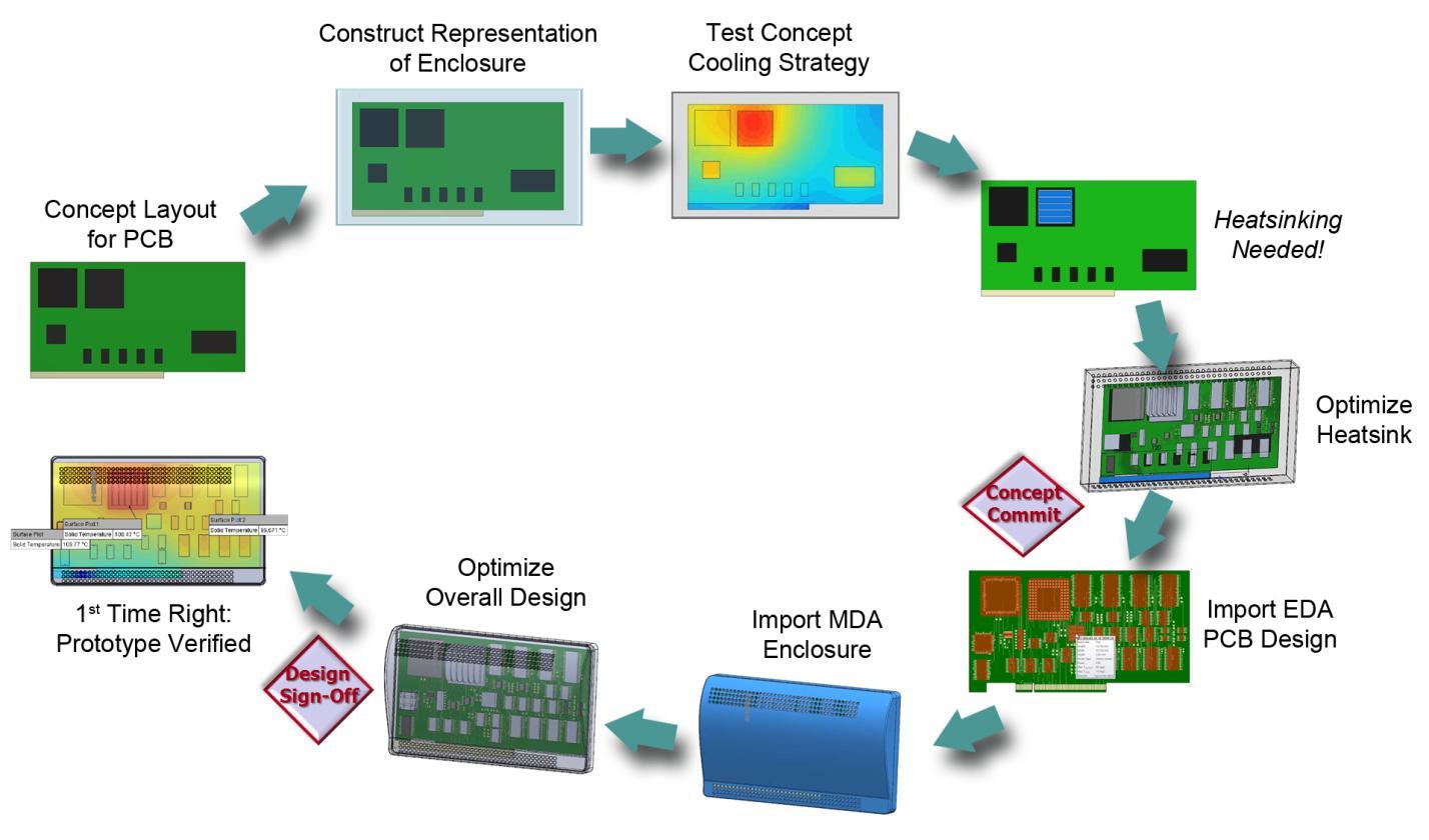 持續該過程直至設計師滿意(他/她得到了很好的熱管理解決方案)為止。與熱相關的零部件正確放置于PCB板上。PCB板正確放置于機箱內。機箱形狀和材料可提供良好的傳導、對流或熱輻射散熱。然后,即可結束概念設計工作,信息傳遞給 MDA 和 EDA 設計師,用于詳細設計。