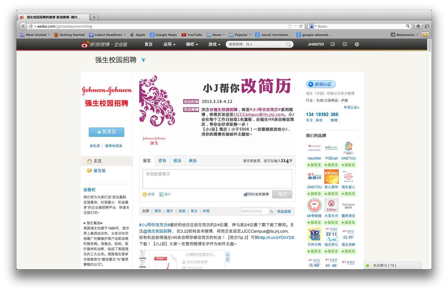 毋庸置疑,對(duì)于企業(yè)而言,為了使社交媒體賬戶擁有更大訪問(wèn)量,舉辦活動(dòng)始終是一種非常好的方法。然而 ,我們卻見(jiàn)許多企業(yè)將原本應(yīng)以“分享與評(píng)論”為主題的活動(dòng)變?yōu)椤瓣P(guān)注并抽獎(jiǎng)”的形式。盡管后者也能達(dá)到品牌推廣的目的,但是與前者相比,這種互動(dòng)方式常常只能產(chǎn)生較低的參與率。最近,強(qiáng)生集團(tuán)在其新浪微博校園招聘賬戶上發(fā)起了一項(xiàng)名為“小J幫你改簡(jiǎn)歷”的活動(dòng)。在參與活動(dòng)的過(guò)程中,學(xué)生們可以將個(gè)人簡(jiǎn)歷發(fā)給強(qiáng)生集團(tuán)并且對(duì)相關(guān)活動(dòng)內(nèi)容進(jìn)行評(píng)論和轉(zhuǎn)發(fā)。每一天,強(qiáng)生集團(tuán)人力資源部會(huì)選出一份簡(jiǎn)歷對(duì)其進(jìn)行修改,并將修改樣本發(fā)布在其微博平臺(tái)供學(xué)生們下載、參考。這個(gè)活動(dòng)的亮點(diǎn)部分,是使粉絲有機(jī)會(huì)獲得專業(yè)意見(jiàn),并且從中獲益,從而不僅確保了參與率,同時(shí)提高了雇主品牌影響力。