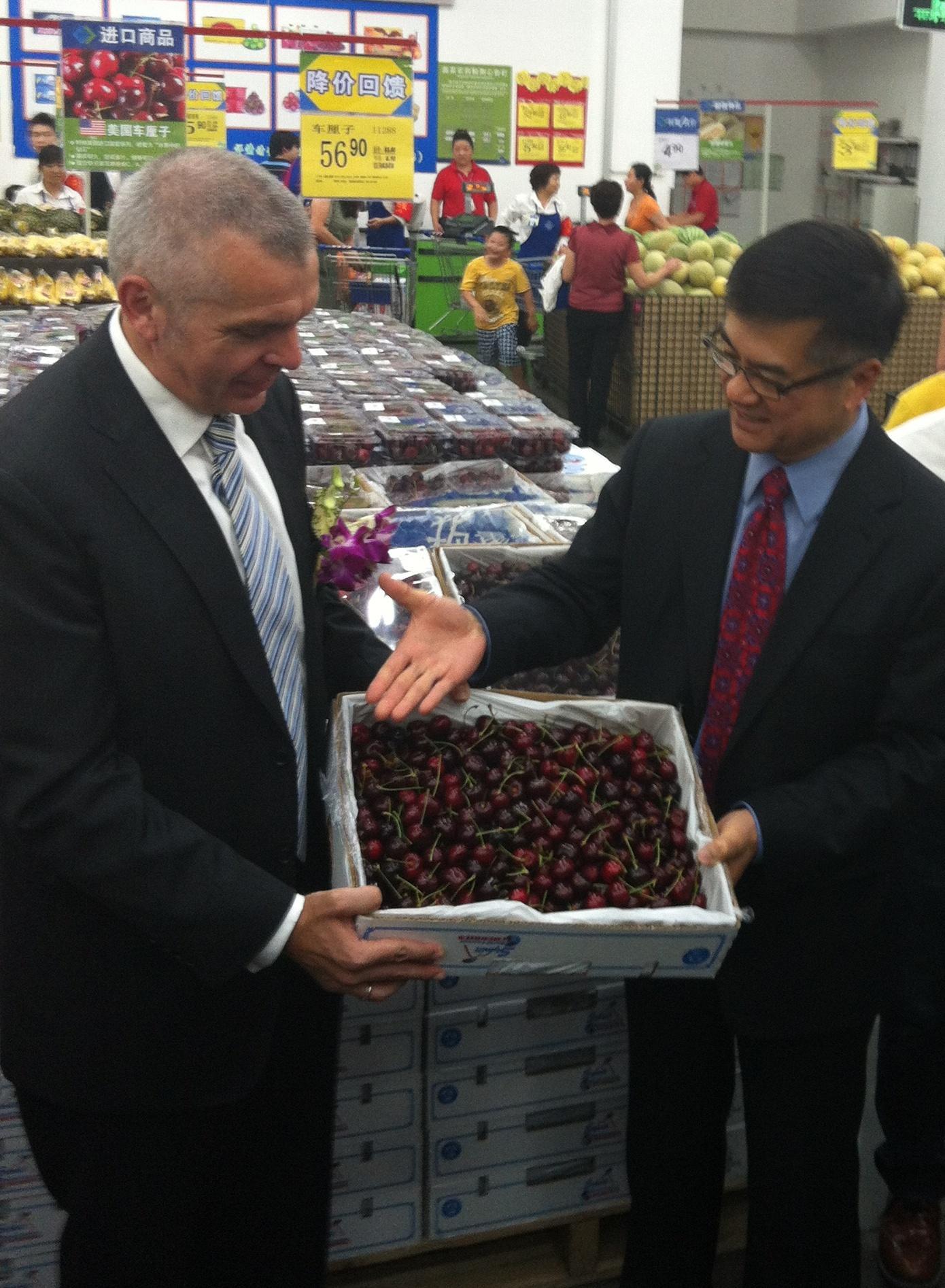 北京2013年7月2日電 /美通社/ -- 烈日當頭的盛夏,一位特別的“促銷員”-- 美國駐華大使駱家輝先生在北京亦莊山姆會員商店現身,他正為推銷剛剛空運到京城的美國西北櫻桃忙得不亦樂乎,一邊發放著櫻桃,一邊自豪地介紹:“西北櫻桃是美國西北地區華盛頓州、俄勒崗州、愛達荷州、猶他州、蒙大拿州所出產的櫻桃的總稱,占了全美櫻桃產量的70%,也是美國銷往世界的櫻桃品種中口感、色澤較好的珍品之一,堪稱水果中的鉆石。”