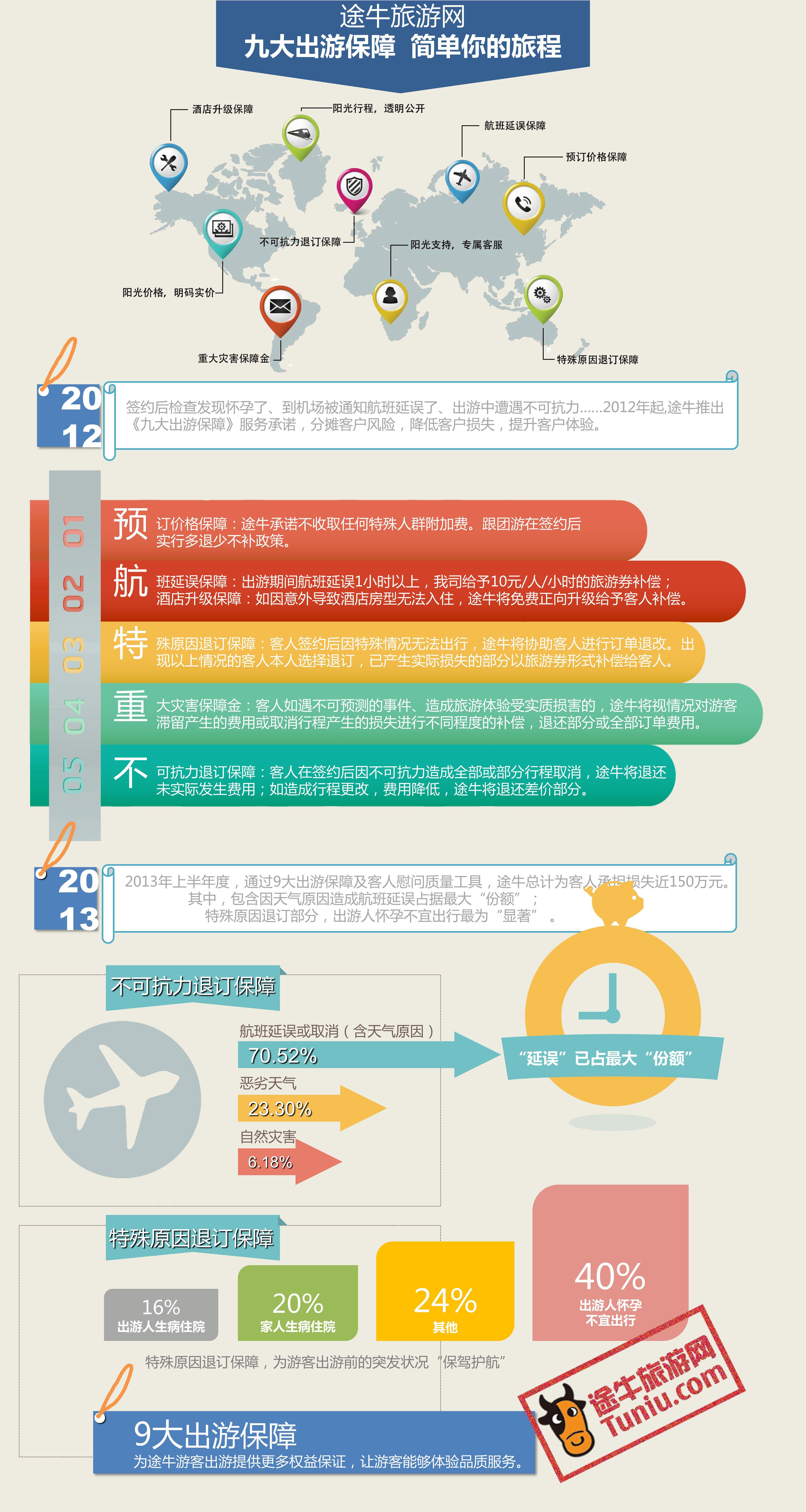 北京和上海2013年7月30日電 /美通社/ -- 簽約后檢查發(fā)現(xiàn)懷孕了、到機(jī)場被通知航班延誤了、出游中遭遇不可抗力……自2012年起,途牛旅游網(wǎng)推出《九大出游保障》服務(wù)承諾,分?jǐn)偪蛻麸L(fēng)險,降低客戶損失,提升客戶體驗。