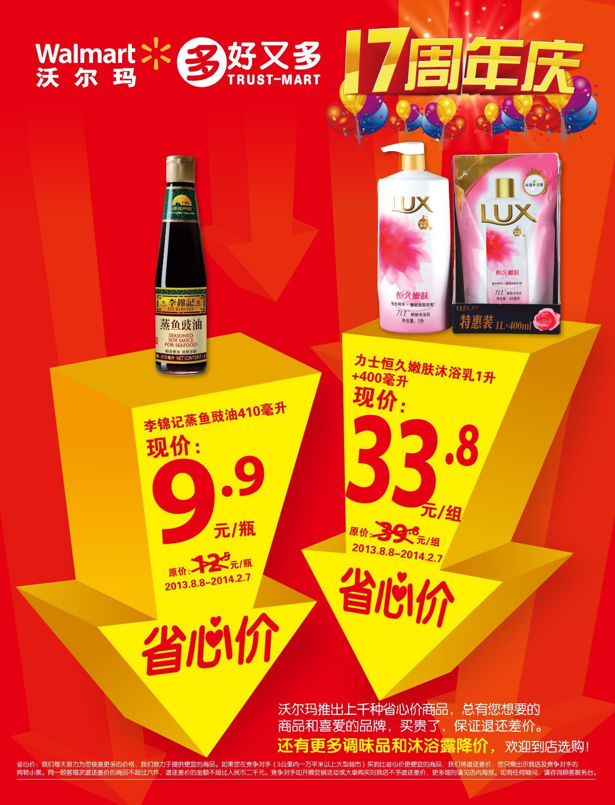 中國深圳2013年8月8日電 /美通社/ -- 今天,沃爾瑪再推特別“省心價”商品:力士恒久嫩膚沐浴乳(1升+400毫升)和李錦記蒸魚豉油(410毫升)。這兩款商品的零售價格分別是:33.8元和9.9元,降價幅度分別達15%和20%,且價格有效期長達半年至2014年2月7日。這已是沃爾瑪今年第三次推出特別“省心價”商品。