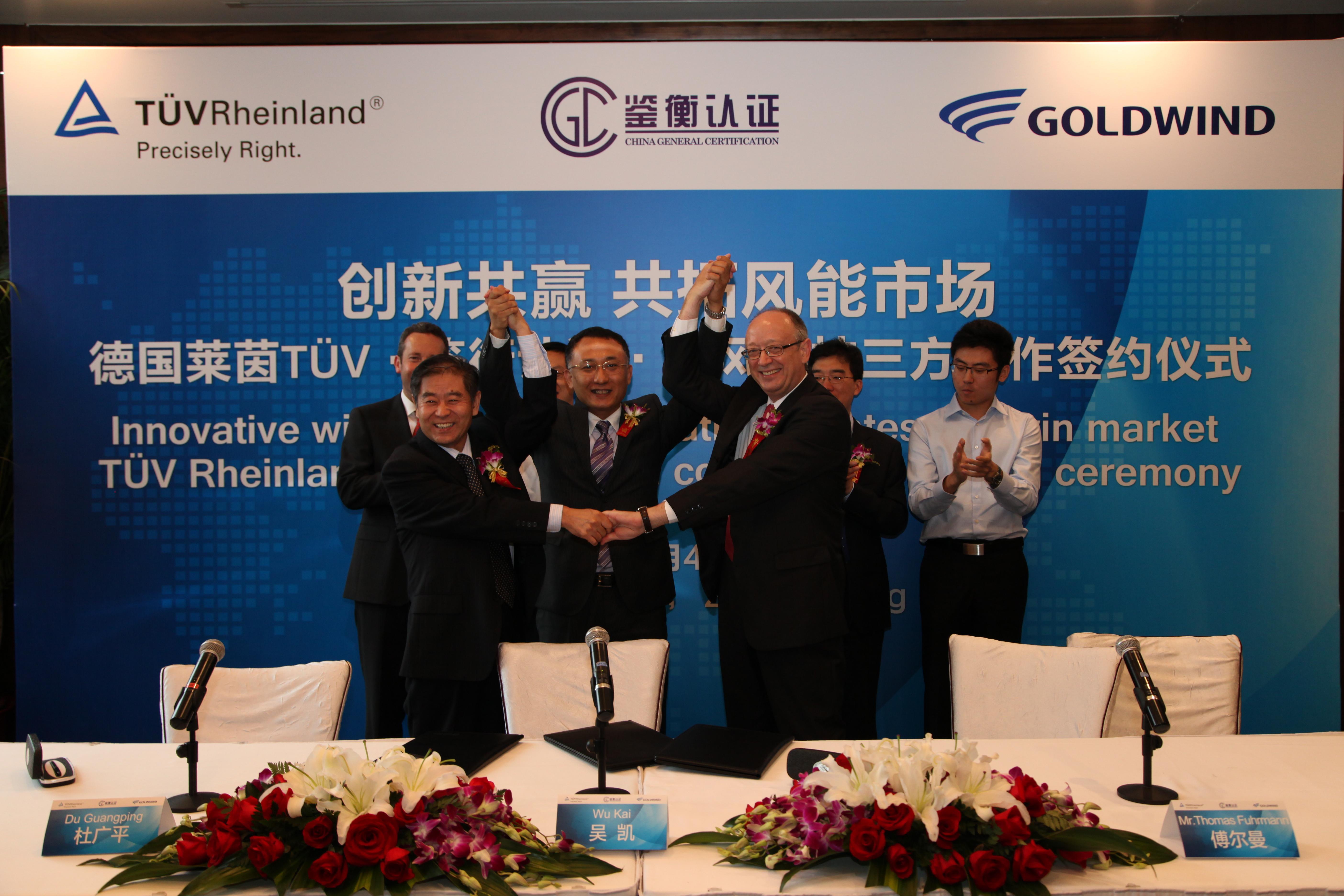 德國萊茵TUV集團牽手北京鑒衡認證中心與新疆金風科技股份有限公司在京共同簽署風電機組認證委托協議。一次認證即可獲得通行海內外的兩張證書是此次萊茵TUV與鑒衡認證精誠合作、開拓創新的全新認證模式。